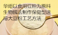 华炬新产品研究所技术咨询委员会科研人员现推荐一项一种以食用豆粕为原料生物酶法制作保健型速溶大豆粉工艺方法,该技术的方法制备保健型速溶大豆粉不仅制备速度快、营养丰富、无苦味、无异味,而且该饮料还具有多种生理功能,现将该一种以食用豆粕为原料生物酶法制作保健型速溶大豆粉工艺方法及技术方案及实施例介绍如下供研究交流参考:(211211 313617)
