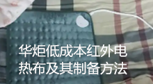 华炬新产品研究所技术咨询委员会科研人员现推荐一项一种低成本红外电热布及其制备方法,该技术目的是为了提供一种红外电热布,它以无纺纤维为基料,以红外波长向外辐射,大大提高了电热转换率,它可做成多种电暖制品,制品局部破损不影响整体功能,克服了现有技术之不足。该技术的另一目的在于提供一种红外电热布的制备方法,技术所述的红外电热布经检测,具有如下性能和技术进步:1、红外电热布通电表面整体发热而均匀;2、发热体局部损坏不影响其它部分的功能,而损坏部位易于修补;3、可任意弯曲、折叠,可加工成所需要的任意形体;4、不怕潮湿,受0.5%NaCl水溶液润湿时不发生短路;5、阻燃试验达到UL94V-1级标准,避免火灾,安全可靠;6、电热转换率高,红外波易被人体吸收,制品具有取暖保健双重作用;7、制品适用交直流电源,6V、12V、36V、交220V均可,安全可靠,特别适宜在高寒、边远以及缺电地区使用。可开发出军需民用多系列产品;8、该技术工艺简单、材料易取,成本低廉。现将该一种低成本红外电热布及其制备方法及技术方案及实施例介绍如下供研究交流参考:(811411 271741)