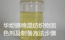 华炬科技新产品研究所技术咨询委员会科研人员现推荐一项一种锦棉混纺织物固色剂及制备方法步骤,该技术相对于现有技术具有如下的显著优点及效果:该技术设计出一种新的锦棉混纺织物固色剂,该固色剂的固色效果明显优于市场上使用的棉用固色剂,可实现在定型机上一步固色,避免了酸性固色工艺,节水节能省人工,具有较大的社会效益,现将该一种锦棉混纺织物固色剂及制备方法步骤及技术方案及实施例介绍如下供研究交流参考:(711421 437599)