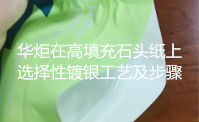 华炬新产品研究所技术咨询委员会科研人员现推荐一项一种在高填充石头纸上选择性镀银工艺及步骤,该技术的优点和积极效果是:1、高填充石头纸制备工艺成熟,原料来源丰富,价格低廉;2、高填充石头纸的使用,可以节约木材,减少水和空气污染;3、高填充石头纸上可以用圆网、平网、凹版等方式印刷图案,其工艺十分成熟;4、高填充石头纸具有良好的防水性能,可以在溶液中进行化学镀银操作;5、对高填充石头纸表面进行化学镀银,可以使已经印刷图案处获得高导电性,其他部位不导电,具有选择性;6、高填充石头纸上进行镀银后,表面的银灰色可以被有效覆盖,不影响外观,现将该一种在高填充石头纸上选择性镀银工艺及步骤及技术方案及实施例介绍如下供研究交流参考:(611441 353591)
