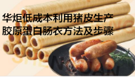 华炬科技新产品研究所技术咨询委员会科研人员现推荐一项一种低成本利用猪皮生产胶原蛋白肠衣方法及步骤,该技术设计科学合理,拓展了胶原蛋白肠衣原料的范围,不再局限于牛皮,在保证产品质量的基础上,降低了生产成本;另外将猪皮胶原蛋白肠衣应用于油炸时,效果优于牛皮胶原蛋白肠衣,现将该一种低成本利用猪皮生产胶原蛋白肠衣方法及步骤及技术方案及实施例介绍如下供研究交流参考:(311211 346723)