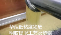 华炬科技新产品研究所技术咨询委员会科研人员现推荐一项一种低粘度猪皮明胶提取工艺及步骤,该技术具有如下优点:通过在熬胶的过程中将ph计一端的电极放入溶液中,通过ph计对熬胶内溶液进行实时检测,在熬胶的过程会将溶液的ph值控制在5.5左右,随着水分的蒸发ph值会逐渐降低,这时通过水泵适量的倒入清水,导入清水的温度的应控制在80℃左右,使在倒入清水对熬胶的溶液ph值调节的过程中,不会太大影响熬胶的温度,增加了熬胶的过程的稳定性,同时为了防止熬胶的过程长时间处于高温状态,在熬胶容器的周围采用水浴控温,通过温度较低的清水吸收热量,当清水温度升高后,将高温的清水倒入,重新倒入清水,可以精确控制熬胶的温度,同时在进行凝胶时,可以加快凝胶的速率,现将该一种低粘度猪皮明胶提取工艺及步骤及技术方案及实施例介绍如下供研究交流参考:(311211 346402)