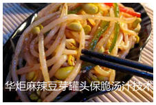 华炬新产品研究所技术咨询委员会科研人员现推荐一项麻辣豆芽罐头保脆汤汁技术配方,该技术产品的使用对以豆芽作为原料的豆芽罐头的生产工艺中,通过热力杀菌,酸化,防腐剂等诸因子的调节,使豆芽罐头在产品脆度,口感,保质期等方面比原有产品有较大提高,现将该麻辣豆芽罐头保脆汤汁技术配方及方法步骤介绍如下供研究参考:(211211 311645)