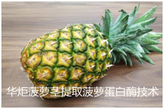 华炬新产品研究所技术咨询委员会科研人员现推荐一项菠萝茎提取菠萝蛋白酶技术工艺方法,该技术利用菠萝茎为原料制作菠萝蛋白酶,制作工艺简单可靠,通过此工艺可提高酶的活性和延长活性保存时间,酶活性从70万U/g提高到160万U/g,常温下保质期6个月提高到20个月,制作的菠萝蛋白酶最适pH值为7.0,分子量为33000,毒性较低,菠萝蛋白酶在生物体中具有溶解纤维蛋白及血凝块的作用,临床上用于治疗一些炎症,能迅速溶痂,对正常组织无害,不影响植皮,性质稳定,使用方便,适用于中小面积深度烧伤的治疗。由菠萝蛋白酶制成的制剂对急慢性支气管炎、哮喘、多痰顽咳、百日咳、等病症疗效明显,现将该菠萝茎提取菠萝蛋白酶技术工艺方法实例介绍如下供研究参考:(241441 521645)