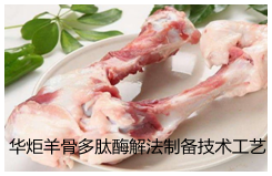 华炬新产品研究所技术咨询委员会科研人员现推荐一项羊骨多肽酶解法制备技术工艺方法,该技术选用两种酶制剂处理羊骨蒸煮液,一方面通过酶解提高羊骨水解度,另一方面采用酶解处理进一步水解,去除水解液的苦味,所得羊骨多肽粉气味清新,可直接服用,易于溶解,未添加任何其它化学试剂达到脱苦效果;操作工艺简单,原材料易于取材且价格低廉,制备过程中反应条件易于控制,生产成本相对低廉;选用的两种酶制剂易于获得且价格低廉,适合工业化生产;所得产品显著优于其他酶解方式的产品,经取样、分析测试后,多肽分子量控制在200-5000道尔顿达85%以上,且所得产品呈淡黄色粉末、气味清新、无苦涩感现将该羊骨多肽酶解法制备技术工艺方法实例介绍如下供研究参考:(311271 331675)