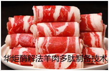 华炬新产品研究所技术咨询委员会科研人员现推荐一项酶解法羊肉多肽制备技术方法,该技术与现有技术相比,该技术以羊肉为原料,生产一种小分子羊肉多肽产品,具有以下优点和有益效果: (1)所得羊肉多肽含量达70%以上,产品呈淡黄色粉末,产品气味清新,可直接服用,易于溶解,无膻味异味;(2)技术工艺操作方法简单,原材料易于取材,制备过程中反应条件易于控制,生产成本相对低廉,适合工业化大规模生产;(3)将羊肉处理为多肽产品,在消除羊肉膻怪味的同时,保留了羊肉的功效成分,以多肽的形式促进人体对羊肉有效成分的吸收利用,适合大众人群食用,现将该酶解法羊肉多肽制备技术方法实例介绍如下供研究参考:(311271 321745)