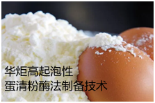 华炬新产品研究所技术咨询委员会科研人员现推荐一项高起泡性蛋清粉酶法制备技术方法,该技术有益效果是:1.用该技术制备的蛋清粉,在外观和口感上与普通蛋清粉相比没有差异,各项指标也均符合国家标准;2. 该技术中制备的蛋清粉相对于普通蛋清粉,起泡力从71.2%提高到94.8%,泡沫稳定性从26.5%提高到45.7%,能够满足对起泡性能要求较高产品的生产需要,如冰淇淋、蛋糕和面包等;3.由该技术制得的蛋清粉与普通蛋清粉相比,具有不易结块,冲调性好,保质期长的优点;4. 该技术还具有工艺简单、成本低廉,易于工业化生产的优点,现将该高起泡性蛋清粉酶法制备技术方法实例介绍如下供研究参考:(311311 318645)