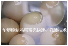 针对目前市场上供应的成品蛋如五香蛋、茶叶蛋、松花蛋、酱汁蛋、囍红蛋等为缩短腌制时间,华炬新产品研究所技术咨询委员会科研人员现推荐一项腌制鸡蛋蛋壳快速扩孔液技术配方,该技术产品的使用能使腌制鸡蛋需要的调味剂、香味能及时进入蛋内,不会走味;同时熟蛋制作的成品率高,相应地降低了生产成本;另外该技术产品具有很好的灭菌功能,在腌制鸡蛋过程中,蛋壳始终完整保持,蛋不易被细菌感染,保证了成品蛋的卫生质量,延长了成品蛋的保质期,其制作周期大大缩短,成品蛋保质期延长,并能根据需求制作出多品种香味的成品蛋。该技术产品具有使用量极少、无毒无害、成本低、适合大规模生产应用的特点,现将该腌制鸡蛋蛋壳快速扩孔液技术配方介绍如下供研究参考:(311311 313387)