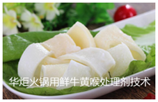 牛黄喉在火锅菜肴中又分为鲜牛黄喉和发制牛黄喉,在火锅中重要的特点就是爽脆,最常吃的牛黄喉主要成分是平滑肌,属蛋白质,相对于肝、胃等内脏营养价值更高一些,若取新鲜的牛黄喉直接入锅涮烫食用,其口感如同嚼橡皮,且不利于消化吸收,所以鲜牛黄喉食用前都需经过处理,经过处理的牛黄喉不但风味独特,而且口感脆嫩,爽口化渣。华炬新产品研究所技术咨询委员会科研人员鲜推荐一项火锅用鲜牛黄喉处理剂技术配方,用该技术产品处理后的鲜牛黄喉具有在贮藏过程中失水率较小,即成品增重率较高,涮烫后保水能力强,牛黄喉入锅涮烫时间稍长也不会变得老韧,以及口感好、脆嫩的特点,现将该火锅用鲜牛黄喉处理剂技术配方及方法介绍如下:(311241  381576