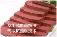 华炬新产品研究所技术咨询委员会科研人员现推荐一项鸭血酶解法制取抗菌肽技术工艺方法,该技术所制备的抗菌肽是鸭血经生物酶水解而得,属于天然提取物,具有天然、无毒、无污染、无残留、无副作用、高效抗菌等特点,是一种新型的绿色抗微生物药物;提取的抗菌肽,对革兰氏阴性及阳性细菌均有高效广谱的杀伤作用,纯化产物的抑菌效果高于6000单位青霉素的抑菌效果,粗提物和纯化物对大肠杆菌均有着较强的抑菌效果;采用的原料来源广泛,价格低廉,经过技术转化可以有效的提高鸭血副产物的附加值,对继续促进鸭养殖业的发展有重要的意义;可以作为药品、保健食品、食品、食品添加剂、药物增效剂等,工艺科学合理,操作简单,具有较强的工业实施性,检测结果,所得抗菌肽肽含量为90.2%,色泽白色细腻。现将该华炬鸭血酶解法制取抗菌肽技术工艺方法实例介绍如下:(311341 337645)