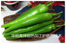 青辣椒护色在餐饮行业是困扰人们多年的技术难题,针对青辣椒热加工后以及热加工后长时间放置保存后极易发黄变褐的现象,国内科研院所、大专院校的专家都在进行相关的研究,特别是在青辣椒护色效果、有效期限和品质保证方面进行不懈努力来满足餐饮行业的普遍需求。