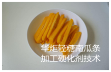 新鲜的南瓜不易贮藏,加工成轻糖南瓜条,食用方便,营养丰富,商品价值提高。加工技术方案是:原料挑选→清洗→去皮切分→硬化→第一次糖煮→第二次糖煮→第三次糖煮→干燥→包装的加工步骤。华炬新产品研究所技术咨询委员会科研人员现推荐一项轻糖南瓜条加工硬化剂技术配方,该技术加工的产品形状饱满,呈黄色条状,口感柔软清脆,有咀嚼性,具有南瓜特有清香的风味,表面干爽,口感清脆香甜,风味独特,食用方便,操作简单。现将该轻糖南瓜条加工硬化剂技术配方介绍如下供研究参考:(211341 271554)