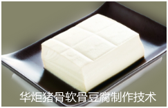 华炬新产品研究所技术咨询委员会科研人员现推荐一项猪骨软骨豆腐制作技术工艺方法,该技术产品采用西式生产工艺,直接用搅拌机将猪骨软骨搅至乳化,再加上大豆分离蛋白、水、淀粉等物质制成豆腐,猪骨软骨的各种营养成份均匀、有效的保留在豆腐中,更有利于人体消化吸收;于其他的豆腐相比,该方法生产的畜禽软骨豆腐,营养丰富,各种营养物质便于人体消化吸收,具有很好的保健功能,而且可以有效的利用猪骨软骨,生产过程中能耗低,污染小,产品有巨大的市场前景,现将该华炬猪骨软骨豆腐制作技术工艺方法实例介绍如下:(311211  321865