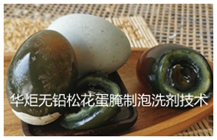 华炬新产品研究所技术咨询委员会 技术人员现推荐一项无铅松花蛋腌制泡洗剂技术配方,经试验实践应用该技术产品侵泡鲜蛋之后再用水清洗和直接用水清洗比较,证明采用该技术产品的水溶液中侵泡鲜蛋之后再用水清洗更能使松花蛋成品外观更光滑完整,其色泽更为诱人,水分可达68%,均为优级,腌制的无铅松花蛋含盐量低,食品安全性高,质量稳定,保质期长,原料易购,价格低廉,使用方便,现将该无铅松花蛋腌制泡洗剂技术配方介绍如下:(311341 323254)