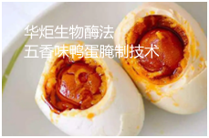 华炬新产品研究所技术咨询委员会科研人员现推荐一项生物酶法五香味鸭蛋腌制技术方法,该技术能够加快鸭蛋蛋白组织与蛋黄中的油脂分离,大大缩短了腌制时间,腌制过程中食盐添加量较低,有利于饮食健康,腌制过程中添五香粉料能改善鸭蛋风味,入味效果极好,腌制出的鸭蛋煮熟后,蛋白不粘壳,蛋黄色泽橙红,蛋白咸度适中,风味独特,营养价值高,每100g咸鸭蛋中含高达52mg的氨基酸,成品率可达100%,产品稳定性好,蛋白、蛋黄、风味等综合感官品质高于传统腌蛋,现将该华炬生物酶法五香味鸭蛋腌制技术方法实例介绍如下:(311341 325645)