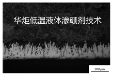 华炬新产品研究所技术咨询委员会科研人员现推荐一项低温液体渗硼剂技术配方及渗硼工艺,该技术工艺在于针对目前固体渗硼、液体渗硼、气体渗硼中存在的缺陷,研究开发的一种渗硼操作温度低,渗硼工件易清理,适于工业化生产的低温液体渗硼剂及渗硼工艺。共渗后工件变形更小、无相变、无内应力、极大推动在精密件上的应用;低温共渗层更厚,约为70~80μm,应用领域广;液体渗硼剂中硼原子活性增强、扩散速率提高、经济性好;加入催渗的氯化铈,能有效降低渗硼温度。现将该低温液体渗硼剂技术配方及渗硼工艺介绍如下供研究交流参考:(611541 224255)