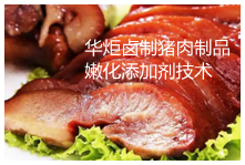 卤制品是中国传统食品,因此质地适口,味感丰富,香气宜人,润而不腻,营养丰富而深受人们喜爱,但卤制时间过久,会造成肉质僵硬,口感风味不佳。华炬新产品研究所技术咨询委员会科研人员现推荐一项卤制猪肉制品嫩化添加剂技术配方,该技术产品可使猪肉制品肌肉纤维适度分散,促进肌红蛋白溶出,提高其嫩度和保水性,促使猪肉制品和表皮紧实,肉质入味锁汁,入味均匀,同时增加猪肉制品的光泽,使其在色、香、味、质达到理想的效果,使猪肉制品的嫩度达到最佳食用状态,且肉色较好,柔嫩多汁,所用原料无污染无毒害,符合食品添加剂使用标准,而且工艺简单,效果明显,具有广阔的工业应用前景和经济价值,现将该卤制猪肉制品嫩化添加剂技术配方及配制方法介绍如下供研究参考:(311211  317265