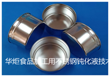 华炬新产品研究所技术咨询委员会科研人员现推荐一项食品加工用不锈钢钝化液技术配方,该技术产品钝化液不含有毒有害物质,且不含有过氧化氢,从而克服现有技术的缺陷,并且制备的钝化膜耐腐蚀性高,性能好;该技术产品钝化液中不含有铬、氟、氯、亚硝酸盐等有毒有害物质,对环境友好,并且适于食品加工用不锈钢的钝化;该技术产品钝化液不含双氧水,因此钝化液稳定,且不存在添加添加剂稳定双氧水的问题;该技术产品钝化液钝化效果好,耐腐蚀性强,现将该食品加工用不锈钢钝化液技术配方介绍如下供研究参考:(841141 123565)