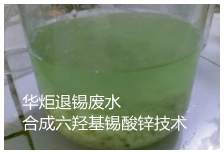 通过对硝酸型退锡废水成分和锡含量的分析,其主要存在的成分为凝胶状态的α型或β型的偏锡酸、硝酸、硝酸铁、硝酸铜以及一些微量的缓蚀剂,其锡的质量浓度可以高达150克/升。因此,退锡废水可以说是一种宝贵的资源,对于回收里面金属锡具有重大的意义。六羟基锡酸锌是一种塑料工业中良好的阻燃剂及烟雾抑制剂,是替代三氧化二锑(Sb2O3)的环保型产品,具有无毒、安全易使用等优点,同时也是一些敏感器材和传感器材制备的材料。
