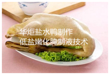 华炬新产品研究所技术咨询委员会科研人员现推荐一项盐水鸭制作低盐嫩化腌制液技术配方,该技术产品的使用不但保留了传统盐水鸭的风味,而且比原有盐水鸭的保水性和持油性能好,口味更香、口感更嫩,含盐量低于3.5%,并完全符合国家规定的食品卫生标准。它不但适合普通人食用,更利于一些老年人、儿童和病人食用。在保持传统盐水鸭风味基础上,进一步改善口感,降低含盐量,延长保质期。现将该盐水鸭制作低盐嫩化腌制液技术配方介绍如下供研究参考:(311341 331363)
