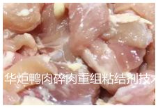 华炬新产品研究所技术咨询委员会科研人员现推荐一项鸭肉碎肉重组粘结剂技术配方,该技术产品的使用是生产重组瘦肉和加有肥肉的重组肉中的应用,一是利用特定pH改性添加剂制备的粘结剂可牢固地粘结各种碎肉,制成重组肉,而且粘结效果显著,重组肉粘结紧密,外观与自然肉相近;二是应用范围广,粘结的碎肉不仅包括猪肉、羊肉、牛肉、鸡肉、鱼肉、鸭肉,而且可以粘结各种瘦肉和肥肉;三是在于该技术产品碎肉粘结剂的成本低廉、制备方法简单;四是在于本发明碎肉粘结剂制备方法中,采用缓冲体系,使粘结剂充分反应,显著提高碎肉粘结剂的粘结效果。该技术产品与其他粘结剂相比,价格相对便宜,操作过程简单,不需要复杂的设备,重组肉的粘结效果好。现将该鸭肉碎肉重组粘结剂技术配方及方法步骤介绍如下供研究参考:(311341 331273)