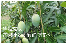 华炬新产品研究所技术咨询委员会科研人员现推荐一项提取芒果叶多酚酶解液技术配方及方法,该技术具有提取温度低、适用性广、提取率高、操作简便等优点;制得的芒果叶多酚纯度在95%以上,提取率为6.5%以上,比传统加热浸提法提取率高1.5%以上,现将该提取芒果叶多酚酶解液技术配方及方法实例介绍如下供研究参考:(241441 231545)