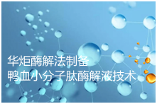 华炬新产品研究所技术咨询委员会科研人员现推荐一项酶解法制备鸭血小分子肽酶解液技术配方及方法,该技术针对现有技术的不足,提供一种生产特定分子量范围具有生理活性的小分子血肽的工艺,提高了血球的水解度,减少了苦味肽生成量。生产工艺不仅提高了产品的附加值,对鸭血资源进行了全效综合利用,而且生产过程中无污染物排放,可达到无环境污染的生态效益。所得产品为浅黄色,无异味,苦味度轻,适口性好,本产品不仅可以替代鱼粉缓解动物蛋白紧缺的局面,还可以部分取代多种提高免疫抗病的药物添加剂,真正生产出自然健康的食品,现将该华炬酶解法制备鸭血小分子肽酶解液技术配方及方法实例介绍如下:(311341 337545)