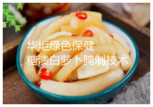 华炬新产品研究所技术咨询委员会科研人员现推荐一项绿色保健糖渍白萝卜腌制技术工艺方法,该技术产品添加部分中药的方法腌制的绿色保健糖渍萝卜不仅可促进胃肠蠕动,有助于体内废物的排出,而且还具有降低血脂、软化血管、稳定血压,预防冠心病、动脉硬化、胆石症和祛痰、减缓筋骨酸痛等作用。添加剂使用量少、方法简单、无毒无害、成本低、适合大规模生产应用的特点。现将该绿色保健糖渍白萝卜腌制技术工艺方法及详细实施例介绍如下供研究交流参考:(211371 223686)