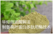 华炬新产品研究所技术咨询委员会科研人员现推荐一项微波酶解法制备桑叶蛋白多肽用酶技术配方及方法,该技术通过釆用微波辅助酶解技术制备具有生物活性的寡肽,不仅提高桑叶蛋白的消化吸收率,而且扩大桑叶蛋白应用领域,使桑叶从单纯养蚕拓展到畜禽饲料、饲料添加剂到人类食品、医药、保健品等多种行业和领域。制备桑叶蛋白多肽的方法具有收率高、纯度高、溶剂消耗少、成本低和易于工业化生产的优点。整个工艺流程短、时间短,能耗低、污染少、不使用有毒试剂、无污染物排放,达到清洁生产目标,现将该微波酶解法制备桑叶蛋白多肽用酶技术配方及方法实例介绍如下供研究参考:(311411 224745)