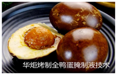 烤全鸭蛋是通过简便的腌制通过烤制的方式呈现,烤制全鸭蛋具有浓浓的焦香味,更重要是它独有的弹性口感,嚼食中有像食肉的感觉和味道,此口感是其它做法所无法比拟和达到的。烤鸭蛋不但具有茶蛋、卤蛋等浓浓的五香味和烧烤的焦糊味,更重要是它独有的弹性口感,嚼食中有像食肉的感觉和味道,它既可以配菜、凉拌、热炒、滚烫、糊炸,还可煎、炸、炒、烙、涮等。华炬新产品研究所技术咨询委员会技术人员现推荐一项烤制全鸭蛋腌制液技术配方,现将该技术配方介绍如下供研究交流参考:(311341 321766)