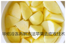 结合冷冻再解冻技术华炬新产品研究所技术咨询委员会科研人员现推荐一项冷冻再解冻法苹果去皮液技术配方,该技术产品通过对苹果进行预先冷冻再解冻的处理方式,使得苹果皮与果肉在物理条件下进行初步分离,同时使得苹果皮的致密性得到疏散,使得其与苹果去皮液的亲和力增强,对苹果进行去皮处理,实现去皮率为99%,且不易褐变,产品外观良好,达到了食品的加工要求,现将该冷冻再解冻法苹果去皮液技术配方及方法介绍如下:(241211 223283)