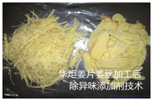 生姜中含有丰富的营养物质,其主要有效成分为挥发油及姜辣素,其中姜辣素又称姜醇、姜酚,姜辣素是生姜的主要辣味成分之一,它的含量有可能会影响一些姜制品的食用口感、药用效果等。所以生姜深加工如清洗、除辣、脱色、保脆等后一般会使得姜片姜丝产品留有少量的异味,特别是针对特殊的用户必须要把这些异味去除,因此华炬新产品研究所技术咨询委员会技术人员现推荐一项姜片姜丝加工后除异味添加剂技术配方,该技术产品配方科学,简洁实用,配方中原料易购,价格低廉,使用后能快速去除姜片姜丝加工后残留的异味,高效安全,现将该姜片姜丝加工后除异味添加剂技术配方及方法介绍如下供研究参考:(211371 262366)