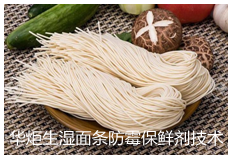 据相关研究表明,目前国内的生鲜面市场并不完善,存在着许多相关问题。例如,生产大多处于作坊阶段,因此不仅产品的质量参差不齐,而且其卫生和质量也很难得到保证,尤其是其货架期内的霉变,已经成为一项影响生鲜面货架期的重要因素。因此,有针对性的对其货架期内的防霉,对于生湿面的工业化生产具有重要作用。华炬新产品研究所技术咨询委员会科研人员现推荐一项生湿面条防霉保鲜剂技术配方,该技术产品的使用是一种防止生湿面货架期内霉变的防霉剂,能够延长其保质期,利于生湿面的工业化生产及贮藏、运输。现将该生湿面条防霉保鲜剂技术配方介绍如下供研究交流参考:(371211 237645)