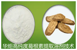 葛根是一种豆科植物葛或甘葛藤的干燥根,又叫甘葛、粉葛、黄葛根等,黄酮类化合物葛根素为中药葛根的主要有效成分,此外还有其它异黄酮类化合物,包括大豆苷、大豆苷元、葛根素等10余种,还含有胡萝卜苷、氨基酸、香豆素类等。以葛根为原料提取的葛根素已经被广泛应用到了各国的保健食品、生物制药等领域,近代药理研究也证明,葛根中所含有效成分葛根素具有改善心脑血管循环、降低心肌耗氧量,降低血糖,防止高血压及动脉硬化,抗肝脏毒,抗炎,祛痰,解热,提高肌体免疫力,抗菌,抗病毒等多种药理作用。随着葛根素的药理作用的研究深入,葛根素的提取也越来越受到人们的重视,目前,对于葛根中总黄酮葛根素的提取方法主要包括溶剂分离法、络合萃取技术、聚丙烯酰胺层析法、冰醋酸结晶法等提取、纯化方法等等。