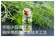 华炬新产品研究所技术咨询委员会科研人员现推荐一项小茴香精油纳米微胶囊制备技术工艺方法,该技术制备的小茴香精油微胶囊的热稳定性好,经高温处理后小茴香精油中的有效成分损失少;溶解性好,解决了小茴香精油不溶于水使应用受到限制的不足,扩大了小茴香精油的应用范围;小茴香精油微胶囊化后,许多性质得到改善,水溶性提高,稳定性增加,挥发性降低,有效成分得到较好的保护,可延缓其氧化变质,延长保质期。 工艺简单,成本低廉,制备条件容易控制,得到的微胶囊颗粒近似球形,产品具有良好的稳定性和溶解分散性,可广泛应用于是食品、医药等行业,现将该小茴香精油纳米微胶囊制备技术工艺方法实例介绍如下供研究交流参考:(371511 653685)