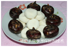荸荠是莎草科、荸荠属植物,荸荠是中国的特色蔬菜之一,通常以地下膨大球茎供食用,可以生食、熟食或做菜,尤适于制作罐头,称为清水马蹄",是菜馆的主要佐料之一;荸荠既是水果又是蔬菜,它口感酥脆,营养丰富,许多人喜欢在生活中吃它。为了解决去皮荸荠易褐变腐烂、不易储存、携带不便等技术问题,华炬新产品研究所技术咨询委员会技术人员现推荐一项去皮荸荠保鲜剂技术配方,该技术产品能有效克服去皮荸荠易褐变、腐烂变质的缺点,能最大限度地保持荸荠特有的营养和风味口感,极大延长去皮荸荠的保鲜期和货架寿命,且易于携带、即食方便的特点,同时具有对荸荠护色,增加去皮荸荠果肉的硬度的效果。