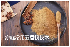 五香粉是一种复合型的粉状调味品,它因配料不同,有多种不同口味,适宜不同人群的口味需求,是烹饪佐餐不可缺少的调味品。华炬新产品研究所技术咨询委员会科研人员现推荐一项家庭常用五香粉技术配方及方法,该技术产品效果是具有麻辣香甜,配制简单,成本低廉,香味纯正的优点,现将该家庭常用五香粉技术配方及方法及实例介绍如下供研究参考:(371511 221544)