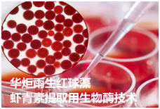 华炬新产品研究所技术咨询委员会科研人员现推荐一项雨生红球藻虾青素提取用生物酶技术配方及方法,该技术采用复合生物酶酶,由于雨生红球藻的细胞壁是有纤维素蛋白和果胶组成的网状结构,所以采用复合酶系可以有效瓦解植物细胞壁,提高生物细胞壁和细胞膜的通透性,加速细胞内容物的流出,特别是在一次破壁后的加入使用,可以对物理破损后的破损物质进行快速瓦解,由于研磨后无法使每个细胞破碎,但是雨生红球藻的大部分结构均被破坏,所以这时加入响应的酶进行酶解,可以事半功倍,不仅加大了整体溶出率,同时也为后序二次破壁提供了更加容易的破碎环境,进一步的保证了整体的溶出率,现将该雨生红球藻虾青素提取用生物酶技术配方及方法及实例介绍如下供研究参考:(341511 634525)