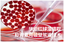 华炬新产品研究所技术咨询委员会科研人员现推荐一项红球藻提取虾青素用破壁浆液技术配方及方法,该技术冰浴条件下,破壁浆液可以更快的渗透到雨生红球藻细胞的表层;在匀浆过程中,利用螺旋桨施加的搅拌离心力、挤压力、剪切力对海藻细胞进行破碎,并且物料之间的摩擦力加速细胞表面的冰醋酸对细胞壁结构中糖蛋白的破坏;同时,由于冰浴的破壁浆液的介入避免了匀浆过程中温度的升高,最大程度的保护了虾青素的理化活性,所得的虾青素提取物为暗红色粘稠物质,细胞的破壁率高达97.7%,虾青素提取物的提取率达到37%,虾青素的提取率达到35.05%,产物中虾青素纯度极高达到95.25%,现将该红球藻提取虾青素用破壁浆液技术配方及方法及实例介绍如下供研究参考:(341511 634435)