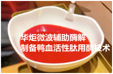 华炬新产品研究所技术咨询委员会科研人员现推荐一项微波辅助酶解制备鸭血活性肽用酶技术配方及方法,该技术是一种微波辅助酶解制备鸭血活性肽 的方法,包括如下步骤:鸭血抗凝,离心分离,超声波破壁,微波辅助酶 解,二次酶解,灭酶,膜过滤,喷雾干燥。以鸭血为原料,充分利用鸭血资源,避免鸭血资源的浪费。用微波辅助酶解,缩短酶解反应时间,提高生产效率。制备的活性肽,生物活性好,对氨基酸营养破坏小。方法工艺简单,成本低,环保,适合鸭血深加工的工业化生 产,现将该微波辅助酶解制备鸭血活性肽用酶技术配方及方法及实例介绍如下供研究参考:(311341 337648)