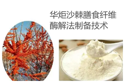 华炬新产品研究所技术咨询委员会科研人员现推荐一项沙棘膳食纤维酶解法制备技术方法,该技术采用的技术方案是采用组合式酶解技术,即 使用蛋白酶水解提取和纤维素酶酶解改性相结合的工艺技术,提供一种把 脱脂沙棘籽渣为原料制取可食用膳食纤维的方法。制备的沙棘膳食纤维经超微粉碎后颗粒细腻、呈微黄色、无 特殊气味,总膳食纤维含量达80%以上,其中可溶性膳食纤维含量达30%以 上,可以作为多种食品、饮品、保健食品等的营养强化剂,现将该沙棘膳食纤维酶解法制备技术方法实例介绍如下供研究参考:(241271 321585)