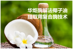 华炬新产品研究所技术咨询委员会科研人员现推荐一项酶解法椰子油提取用复合酶技术配方及方法,该技术制得的椰子油水分含量低,营养物质含量高,具有极高的使用价值好经济价值。微波加热使得椰肉从内部加热,椰肉的细胞内的水分汽化冲破细胞壁,从而加快酶解速度,并且有利于细胞内营养物质的流出的同时,减少对营养物质的损害。在超声波的空化效应下也能使椰肉细胞结构破坏,有助于油脂的提取。从而有效的提高了出油率;在不使用有机溶剂,不采用高温处理的条件下,有效的提取出椰子油,并且制得的椰子油清澈透明,具有浓郁的椰香;提取方法简单安全、出油率高、成本低,能耗低,提取油脂后的残余液体富含蛋白和多肽,可回收再利用,残余固体富含膳食纤维和多糖,可用作动物饲料或为微生物发酵提供碳源,废水易于处理,不会产生对环境有害物质,具有良好的应用前景,现将该酶解法椰子油提取用复合酶技术配方及方法及实例介绍如下供研究参考:(241441 331645)