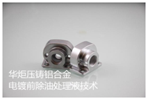 压铸铝合金,几乎90%多是以Al-Si为基的二元Al-Si合金以及其中含少 量Cu、Mg、Ni等其它元素的多元Al-Si系合金,压铸铝合金,由于其铸造工艺及组织结构的特异性,使其镀前预处理极为困难,镀后易出现结合力不良的现 象。为防止压铸铝合金基体被空气中的氧气氧化,基体表面一般都会有一层油脂来保护,这些油脂必须在进行电镀加工前清洗干净,否则会使镀层出现瑕疵,如针孔、毛刺等,严重时会导致电镀失败、返工、致使镀液失去平衡和稳定性。因此,在电镀过程中选择一种优质的除油产品,是非常重要的。