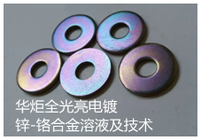 华炬新产品研究所技术咨询委员会科研人员现推荐一项全光亮电镀锌-铬合金溶液及技术工艺方法,该技术中的全光亮电镀锌(Zn)-铬(Cr)合金溶液是以硫酸锌-氯化铬- 尿素为主要成分的弱酸性硫酸盐型镀液体系,合金电镀溶液稳定、成分简单、电流 效率高(接近100%)、沉积速度快、光亮剂易配制、维护与管理方便,克服了电镀溶 液中三价铬离子不能长期稳定地持续电沉积问题,从而稳定了合金镀层中的铬含量 (5%-8%),提高了合金镀层的防护性与装饰性,实现了连续化生产,主要用于取代 传统钝化锌铬膜(无论是六价铬钝化或是三价铬钝化)的镀锌层及其它锌合金镀层 如锌-铁合金、锌-钴合金和锌-镍合金等,多用作组合镀层的底层使用,或作为光亮 的耐蚀性表面镀层;同其它的电镀锌铬合金溶液相比;该技术提供的光亮剂加入该电镀锌(Zn)-铬(Cr)合金溶液中按常规方 法进行电镀,保证了三价铬离子持续、稳定地与二价锌离子发生共沉积,改善提高 了溶液的阴极极化能力、分散能力和覆盖能力,提高了镀层的含铬量及致密度,扩 大了电镀液的工作温度范围,提高了电镀产品外观的光亮度及其高耐腐蚀性,实现 了电镀锌(Zn)-铬(Cr)合金长期稳定地连续化生产等优点,所获得的镀层经锉刀 试验法和弯曲试验法测试镀层与基体的结合强度,试验后镀层未出现起皮、脱落等 现象,现将该全光亮电镀锌-铬合金溶液及技术工艺方法实例介绍如下供研究参考:(841133 131685)