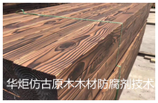 华炬新产品研究所技术咨询委员会科研人员现推荐一项仿古原木木材防腐剂技术配方及方法,该技术产品防腐效果好,本防腐剂能渗入木材面1~2mm,使用本防腐剂后的木材防腐、防水的耐久性强;该技术产品防腐剂涂于木材表面,渗透力强,容易干燥,使防腐处理时间短;本防腐剂的原料容易获得;本防腐剂具有无色、无光、透明等特点,用于喷烧仿古原木表面不但保证其防腐、防水的耐久性,又保护了喷烧仿古原木的纹理自然流露的效果,现将该仿古原木木材防腐剂技术配方及方法实例介绍如下供研究参考:(571411 545365)