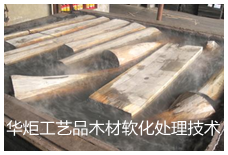 在木制工艺品的加工过程中,对作为原料的木材进行软化是非常重要的步骤。在通常条件下,木材是一种缺乏塑性的材料,通过对木材进行软化处理,可以使其表现出暂时的塑性,此时即可对木材进行弯曲、压缩、浮雕等塑性加工,然后在变形情况下干燥,恢复其原有的刚度和强度,实现木材的永久塑性变形,使制作的工艺品强度高,形态美观,装饰性能好。通常的软化方法有水煮、高温高压水蒸气处理和化学药剂处理。经过这些方法处理的木材尺寸稳定性差,加工性能和使用性能也会受到不良影响。