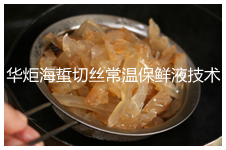 海蜇生于东海,大者如床,小者如斗。气味:咸、温、无毒。主治:妇人劳损、积血带下,小儿风疾丹毒,烫火伤。炸出以姜,醋进之。人们捕捞上来的新鲜海蜇,饱含着大量的水,马上脱水,用高度咸盐腌渍起来,待加工食用。待盐脱掉后,又易腐烂,只能保鲜贮运。华炬新产品研究所技术咨询委员会科研人员现推荐一项海蜇切丝常温保鲜液技术配方及方法,该技术常温保鲜海蜇可达12个月,其色、香、味、形不变。所述保鲜液所用的原料符合世界卫生组织WHO和国家卫生部准许用的食品添加剂,现将该海蜇切丝常温保鲜液技术配方及方法实例介绍如下供研究参考:(341541 223557)
