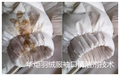 羽绒服因机洗容易使羽绒服的填充物厚薄不均,衣物走形,甚至钻毛,影响美观和保暖性;也可能使部分含涂层的羽绒服出现起泡或涂层脱落现象。如羽绒服整体不脏,仅有局部污渍,不建议整件水洗,可采用局部擦洗;但是局部清洗也有各技术问题,就是任何衣物局部清洗都会在洗过与没洗过的边沿留下痕迹,洗后影响美观,华炬新产品研究所技术咨询委员会科研人员现推荐一项羽绒服袖口清洁剂技术配方及清洁方法,该技术产品不仅可以洗去脏物,还具有杀菌功能,不容易损伤羽绒,造成板结,清洁后对羽绒服原来的弹性、蓬松感、保暖性能没有降低,最大有点是用该技术产品清洁后羽绒服不留任何痕迹,现将该羽绒服袖口清洁剂技术配方及清洁方法介绍如下:(571311 555541)