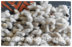 华炬新产品研究所技术咨询委员会科研人员现推荐一项棉籽浸种催芽脱短绒剂技术配方,该技术产品的使用首先可以有效地防止棉花苗病害,棉花出苗后到现蕾,这段时间还很幼嫩,抗逆性较差。再加这时的气候很不稳定,就极易染病害,如炭疽病、立枯病以及检疫性的枯萎病和黄萎病等,种子上的短绒也是重要的传播者,如果将种子外面的短绒脱去,在短绒里的病菌就无处蔵身,连同短绒一起被消灭了,还可以杀死躲在种子内部的病菌;其次就是提高播种质量,棉籽表面由于有短纹,常使好些棉籽牵连在一起,不利于人工或机械播种,经脱绒后种皮光滑,颗颗分开,能有效地防止缺苗、断垄或塔饼花;再次可以提高繁育指数,本来棉籽短绒的表面带有蜡质,影响棉籽的吸水速度,特别在遇到干早天气时,常造成出苗参差不齐,长势弱,脱绒时,蜡质也同时脱去,土壤与棉籽能紧密接触,大大加快了棉籽的吸水速度,保证了苗全苗壮,该技术产品成本低,方法简单快捷,现将该棉籽浸种催芽脱短绒剂技术配方介绍如下供研究参考:(211241 421337)