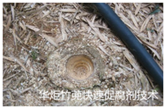华炬新产品研究所技术咨询委员会 科研人员现推荐一项竹蔸快速促腐剂技术配方,该技术产品的应用能在竹蔸内和竹蔸中的木质素发生化学反应生成碱木质素钾或钙,从而加速木质素降解,在降解木质素的同时,也破坏了竹蔸中的半纤维素,并使竹蔸中的纤维素裸露并被部分破坏,这也为纤维素分解菌进一步分解竹蔸创造了条件,因此竹蔸的强度迅速下降,很容易被敲碎,并被清除。该技术产品具有在不对竹林土壤和生态环境造成污染的条件下、以较低的成本、化学的方法、加速竹蔸腐烂,清除竹伐桩,最终促进竹子生长,现将竹蔸快速促腐剂技术配方及操作方法介绍如下供研究参考:(211241 513444)